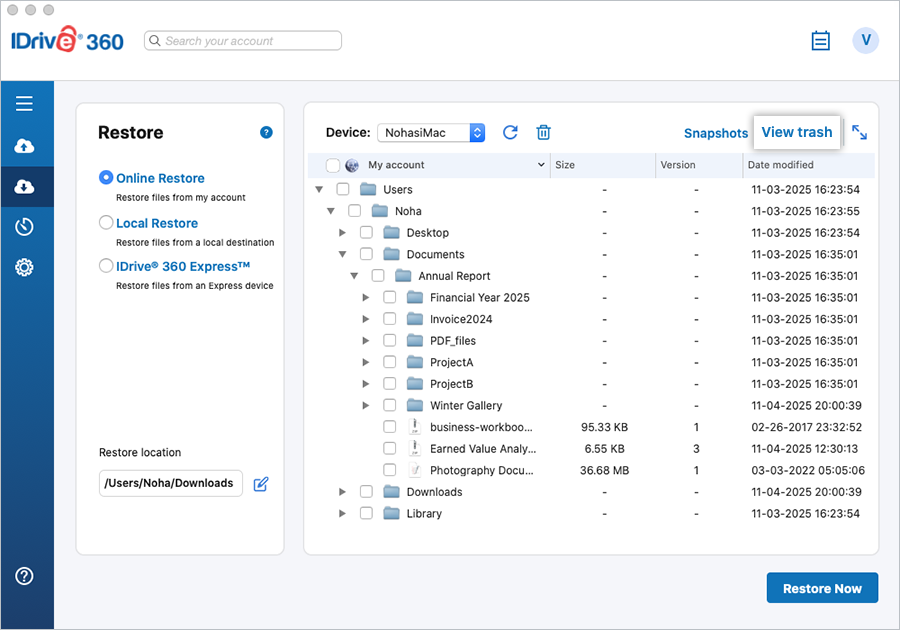 All the files that are deleted from your account will be moved to 'Trash'. You can either move your files to the original location in your IDrive® 360 account or restore them to your local computer. Note that files in 'Trash' are automatically deleted after 30 days.