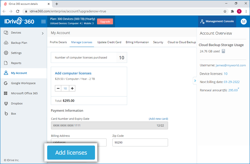 to modify the number of computer licenses you wish to add to your account. By default, the number is set to 10 computers. - Click 'Add licenses'.