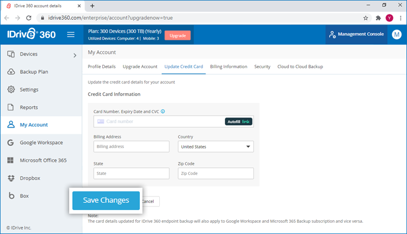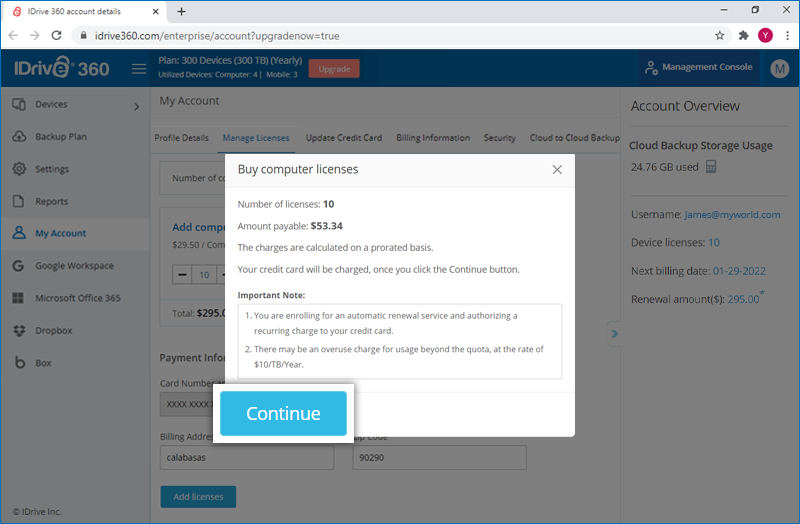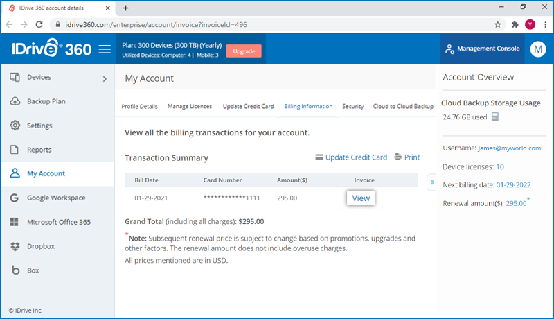 You can view and print the current and previous billing transactions and invoices of your IDrive 360 account easily.