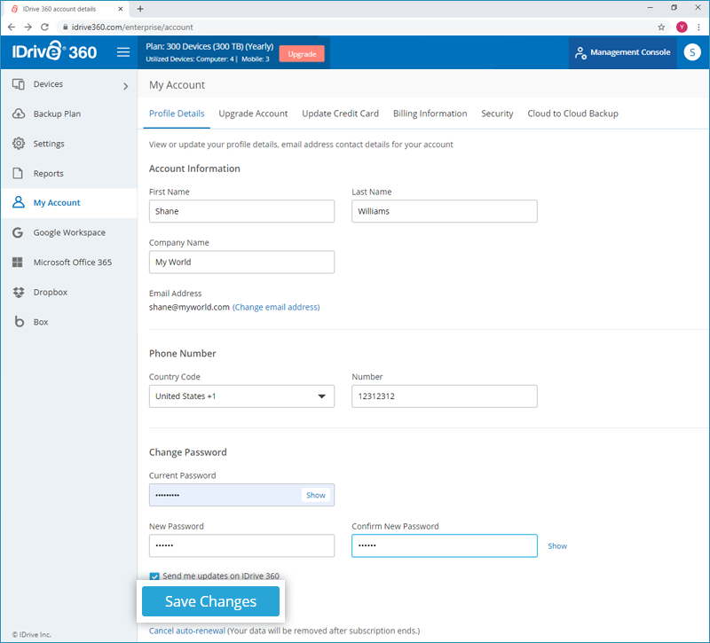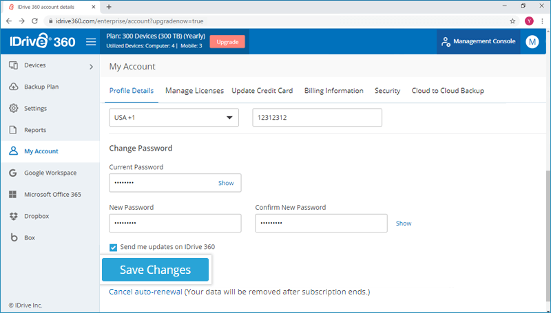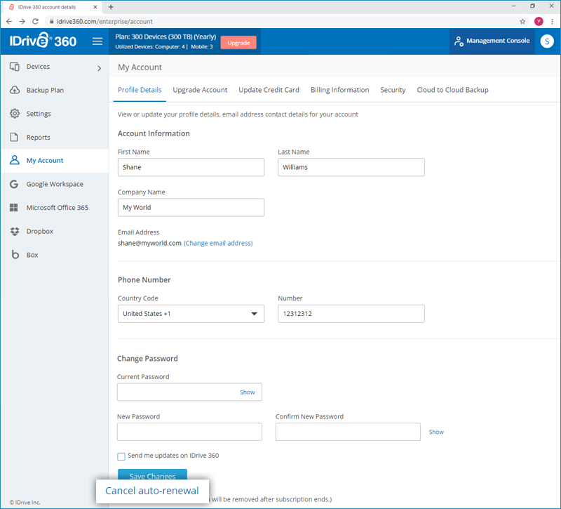 The auto-renewal option is enabled by default after 15 days from account creation. It ensures hassle-free renewal of your account subscription via an automatic transaction, at the end of your current subscription period. It also ensures that your account is always active so your data remains protected. You can disable this option from the 'Profile Details' section of your account.