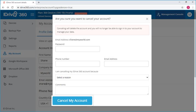 - A popup appears to confirm your cancellation. Enter your password, other information, and click 'Cancel My Account'.