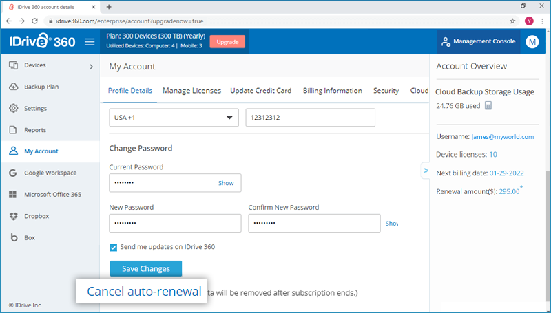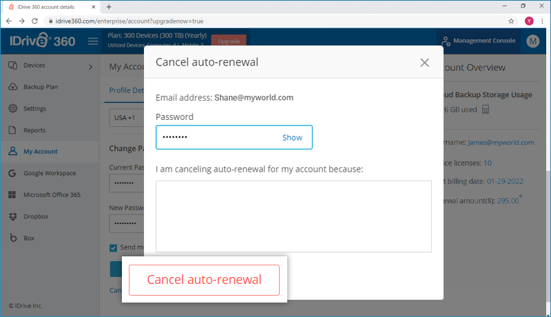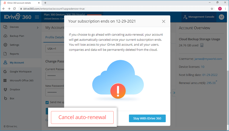 Once canceled, the button will change to 'Enable Auto-renewal' in the profile section. You will lose access to your IDrive 360 account, and your data will be permanently deleted at the end of the subscription.