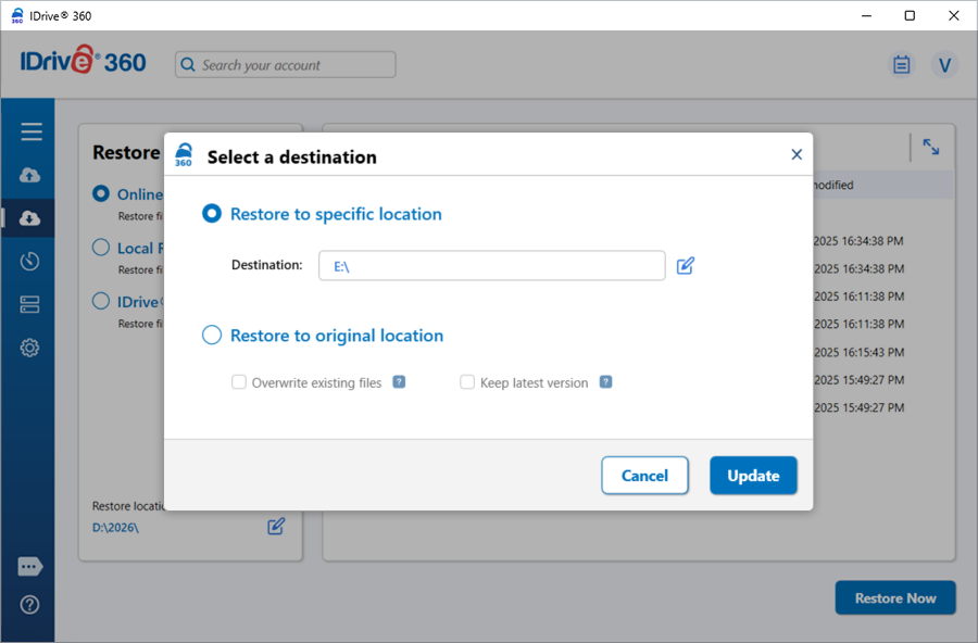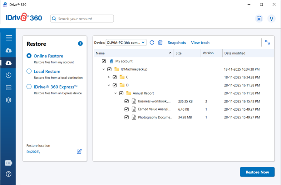 - 2-step restore – Restore your entire system, including the operating system and files, using the machine backup created via the IDrive 360 desktop application. It allows you to recover your full system to a local computer or an external device. Click here to learn more.