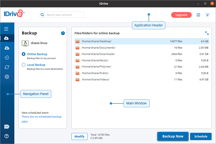 The IDrive desktop application interface is divided into three main sections: the application header, the navigation pane, and the main window.