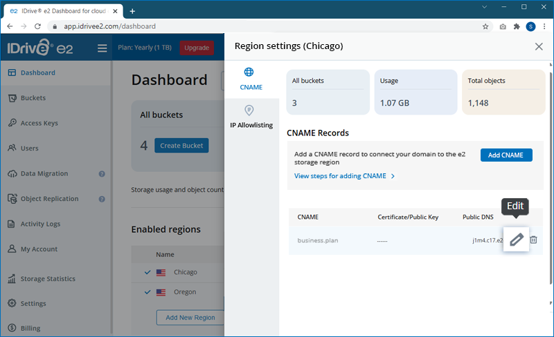 Yes, you can replace IDrive® e2 specific region domain names with your own domain names. You need to create a CNAME record for your domain name server and point that to your e2 region domain name. The Dashboard on the web console lists the IDrive® e2 specific domain names of each enabled region.