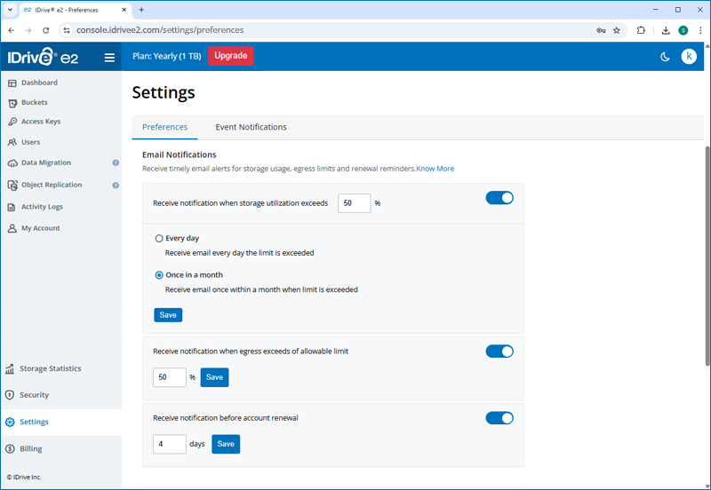 Yes, you can set up email notifications to receive alerts when the storage or egress utilization exceeds a specified limit. Additionally, you can also receive email reminders for account renewal.