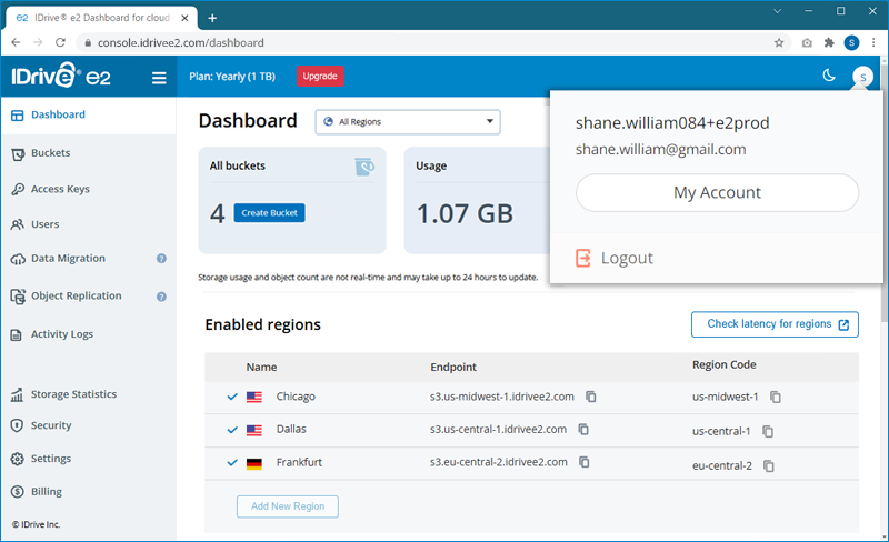 Get an overview of the number of buckets, total storage usage, and the total number of uploaded objects. You can also enable regions for creating buckets in this section.