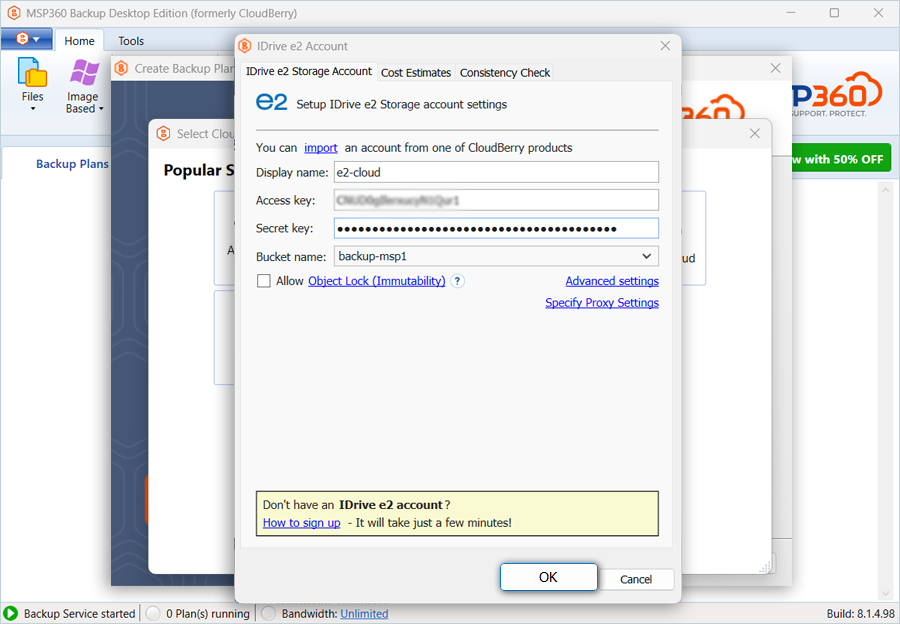 - An active IDrive® e2 account. Sign up here if you do not have one.