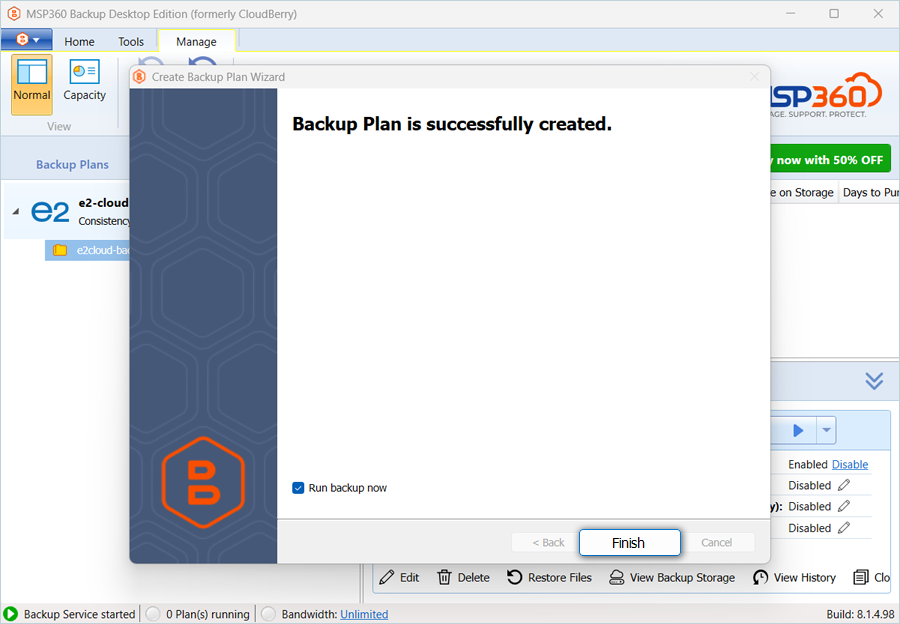 - Select the Run backup now checkbox (to run the job immediately) and click Finish.