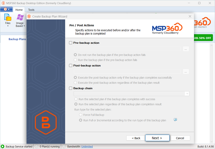 - Update the Pre-backup and Post-backup action preferences and notifications as needed, and then click Next.
