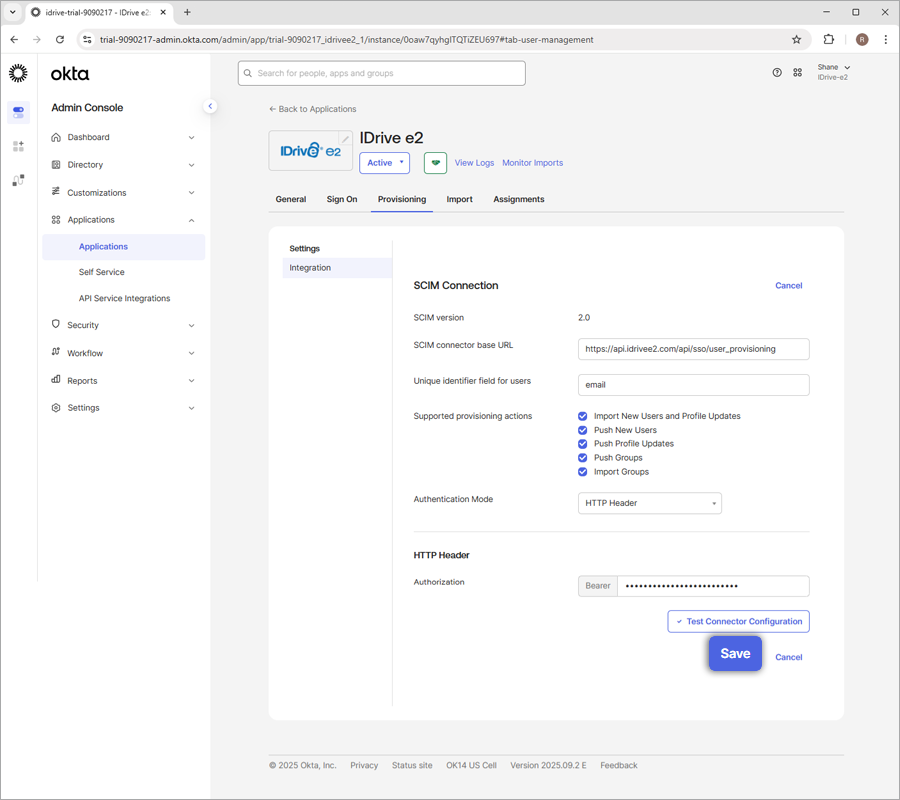 Once the app is created, admin can configure their account for SCIM provisioning.