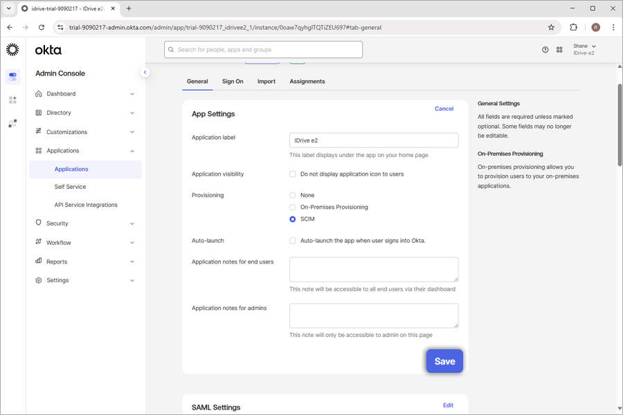 3. Navigate to 'General', click 'Edit' corresponding to the 'App Settings', and select 'SCIM'. Click 'Save'.