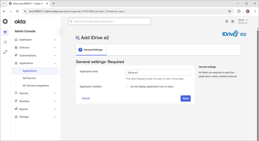 Admin needs to provide the received SAML 2.0 URLs and Certificate in the Single Sign-On application from the IDrive® e2 web interface.
