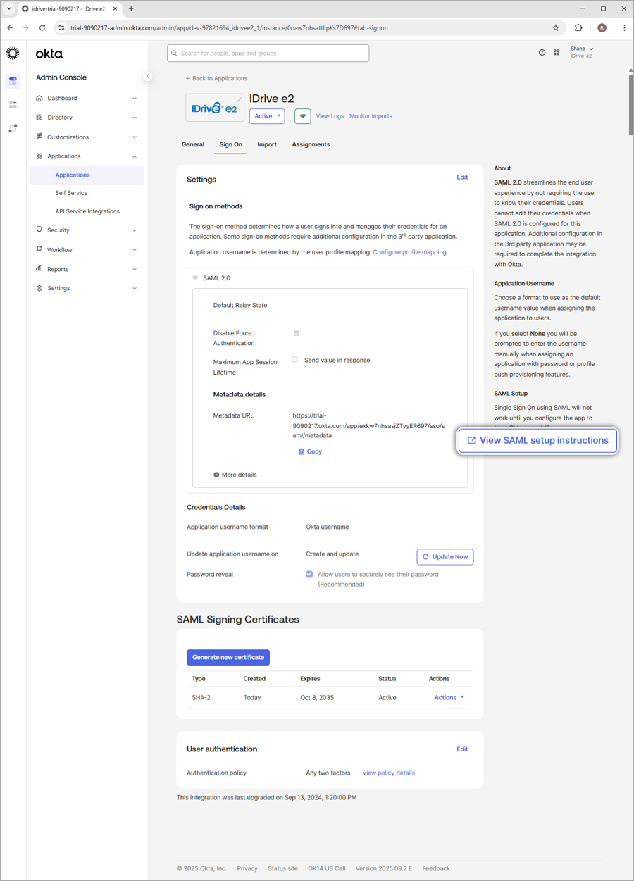 8. Go to 'Sign-On' Options, select SAML 2.0, and click 'View Setup Instructions'. You will be directed to a web page where you will find SAML 2.0 Single Sign-On Login URL, Issuer URL, and the X.509 Certificate. Copy these and paste them on IDrive® e2 SSO settings.